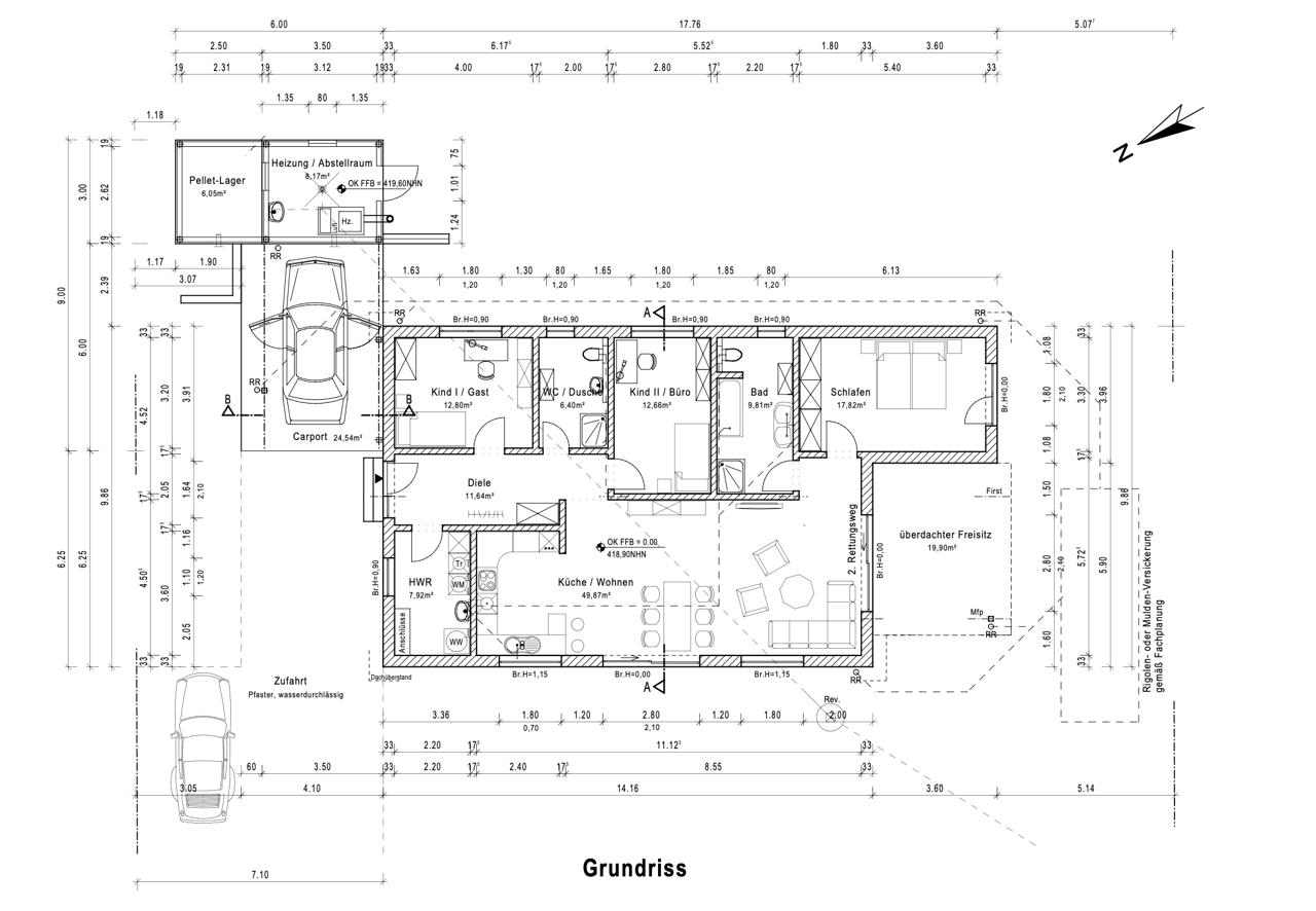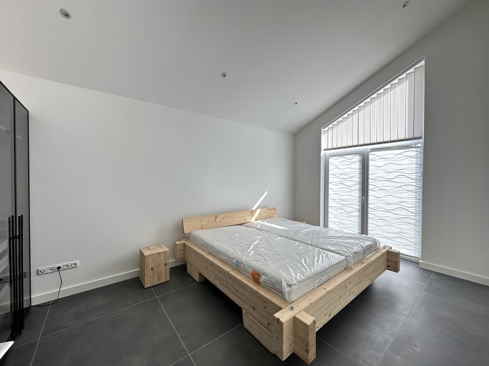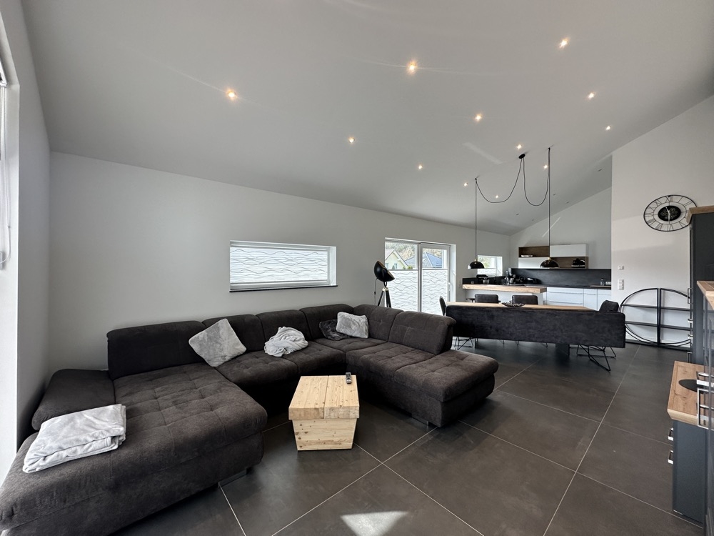 Dieser erstklassige Neubau-Bungalow bietet Wohnkomfort der Extraklasse auf einer einzigen Wohnebene. Die Architektur zeichnet sich durch eine offene Raumgestaltung bis zum Dach hin aus, was in allen Zimmern für beeindruckend hohe und lichtdurchflutete Räume sorgt. Mit einer Wohnfläche von ca. 136 qm, verteilt auf 3 Schlafzimmer, einen großzügigen Wohn-Essbereich mit offener Küche, zwei Badezimmer, eine Diele sowie einen Hauswirtschaftsraum, bietet dieses Haus viel Raum für individuelle Lebensgestaltung. Das ca. 910 qm große Grundstück liegt in einer ruhigern Straße. Neben der Haustür befindet sich eine Parkplatzüberdachung, die an einen extra Hausanschlussraum, der weitere Stellfläche zur Verfügung stellt, angrenzt.