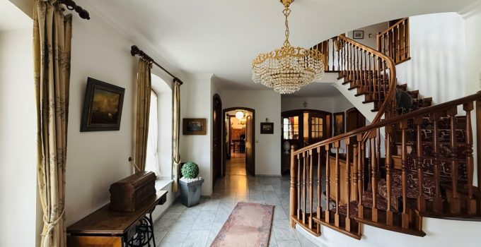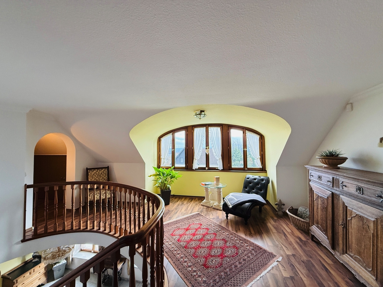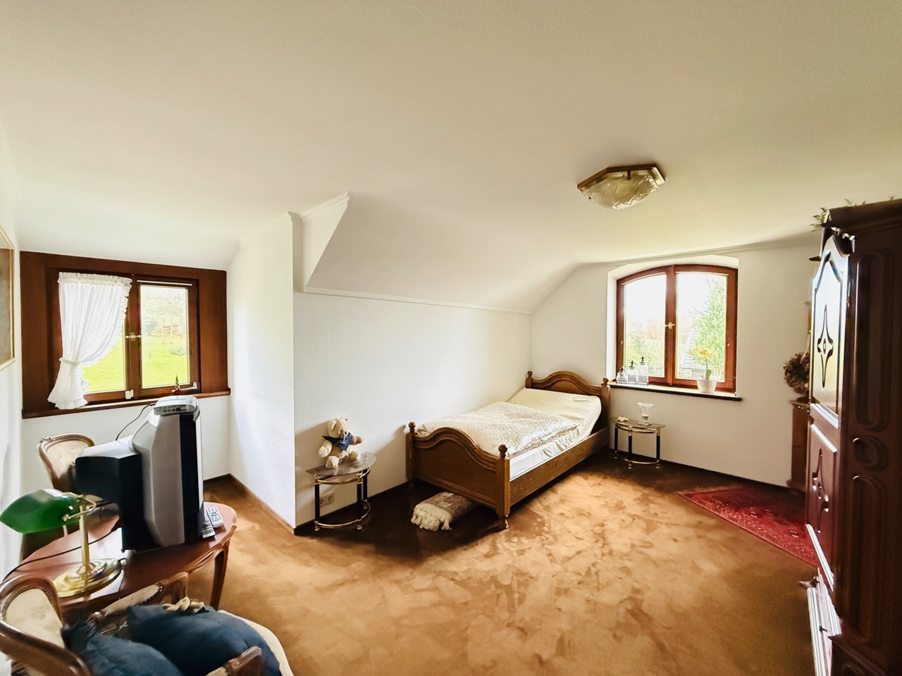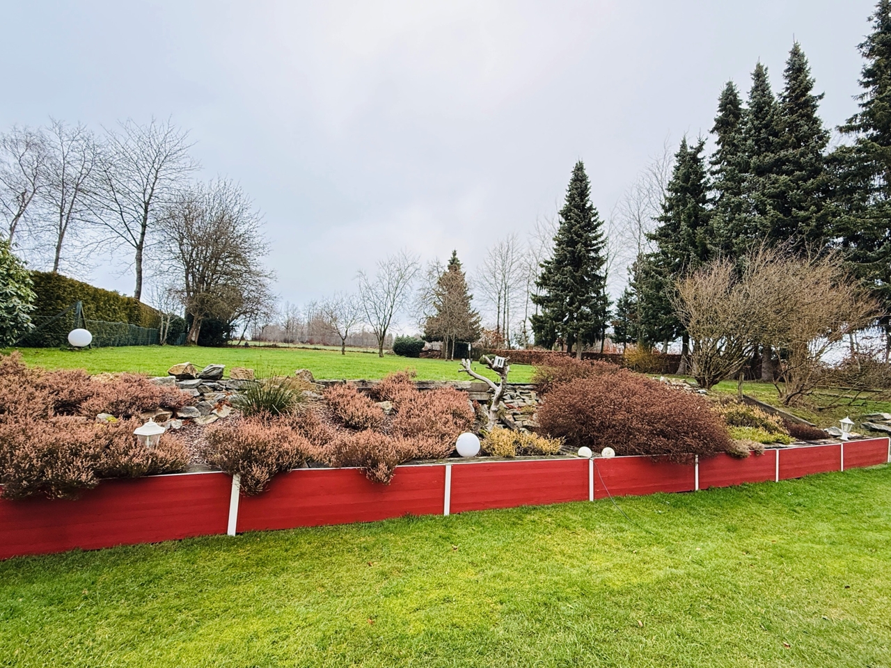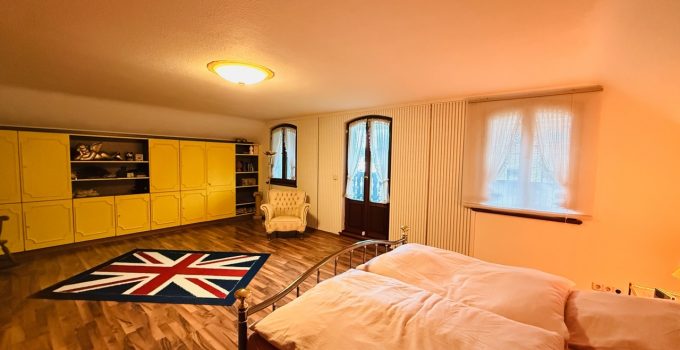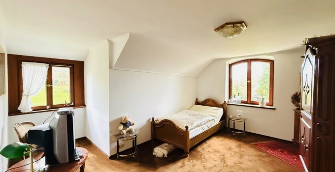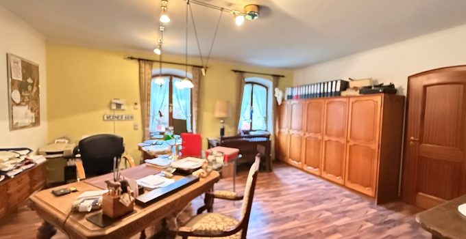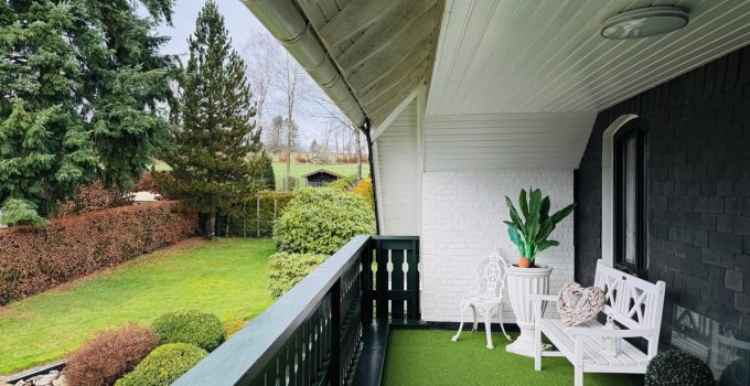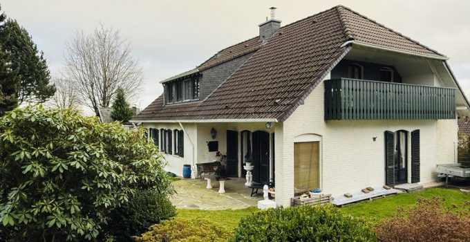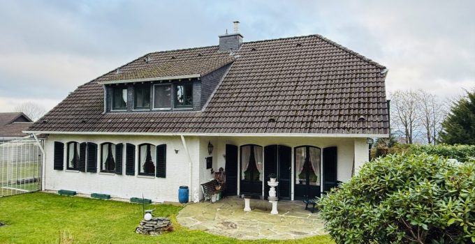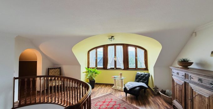 Das freistehende Wohnhaus wurde 1980 als hochwertiges Einfamilienhaus mit integrierter Arztpraxis errichtet und wird heute mit seinen circa 200 m² ausschließlich zu Wohnzwecken genutzt. Von diesen circa 200 m² entfallen etwa 42 m² auf die ehemaligen Praxisräume. Die Architektur ist großzügig und individuell gestaltet, mit einem markanten runden Erker, Fensterläden und einem eindrucksvollen, ebenfalls runden Treppenaufgang. Das Grundstück umfasst ca. 2.487 m² und bietet eine wunderschöne Weitsicht in die umliegende Landschaft. Raumaufteilung Erdgeschoss: Großzügige und einladende Diele, Wohn-Esszimmer mit rundem Erker und großen Fensterflächen, kleine Küche, sehr großes Arbeitszimmer mit angrenzendem Bad, Gäste-WC. Direkter Zugang zur Garage. Obergeschoss: Diele, Gästezimmer, Badezimmer, kleines Zimmer mit besonders schöner Aussicht, großes Schlafzimmer mit Zugang zu einem seitlichen Balkon, zusätzlicher Abstellraum sowie Speicher. Kellergeschoss: Teilunterkellert mit ca. 60 m² Nutzfläche. Ein besonderes architektonisches Merkmal ist die Möglichkeit, auf jeder Etage „rundzugehen“, was den offenen Charakter des Hauses zusätzlich unterstreicht. Das Haus wirkt durch seine teils runden Details verträumt-romantisch und bietet durch die hellen, geräumigen Räume zugleich eine Großzügigkeit.