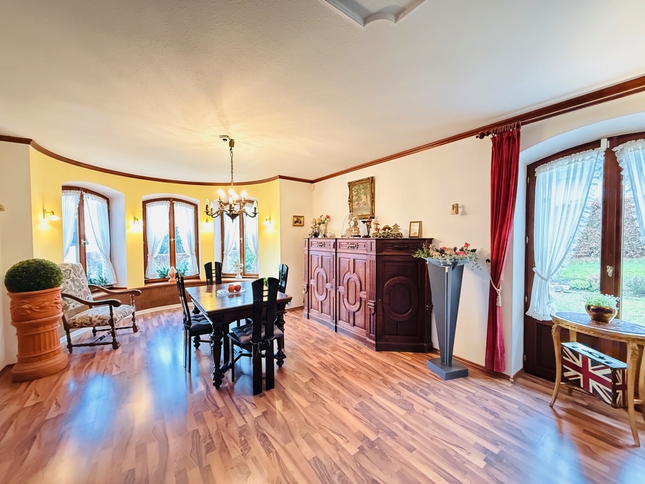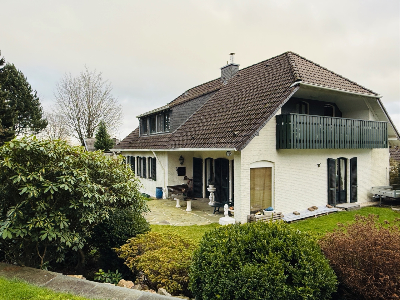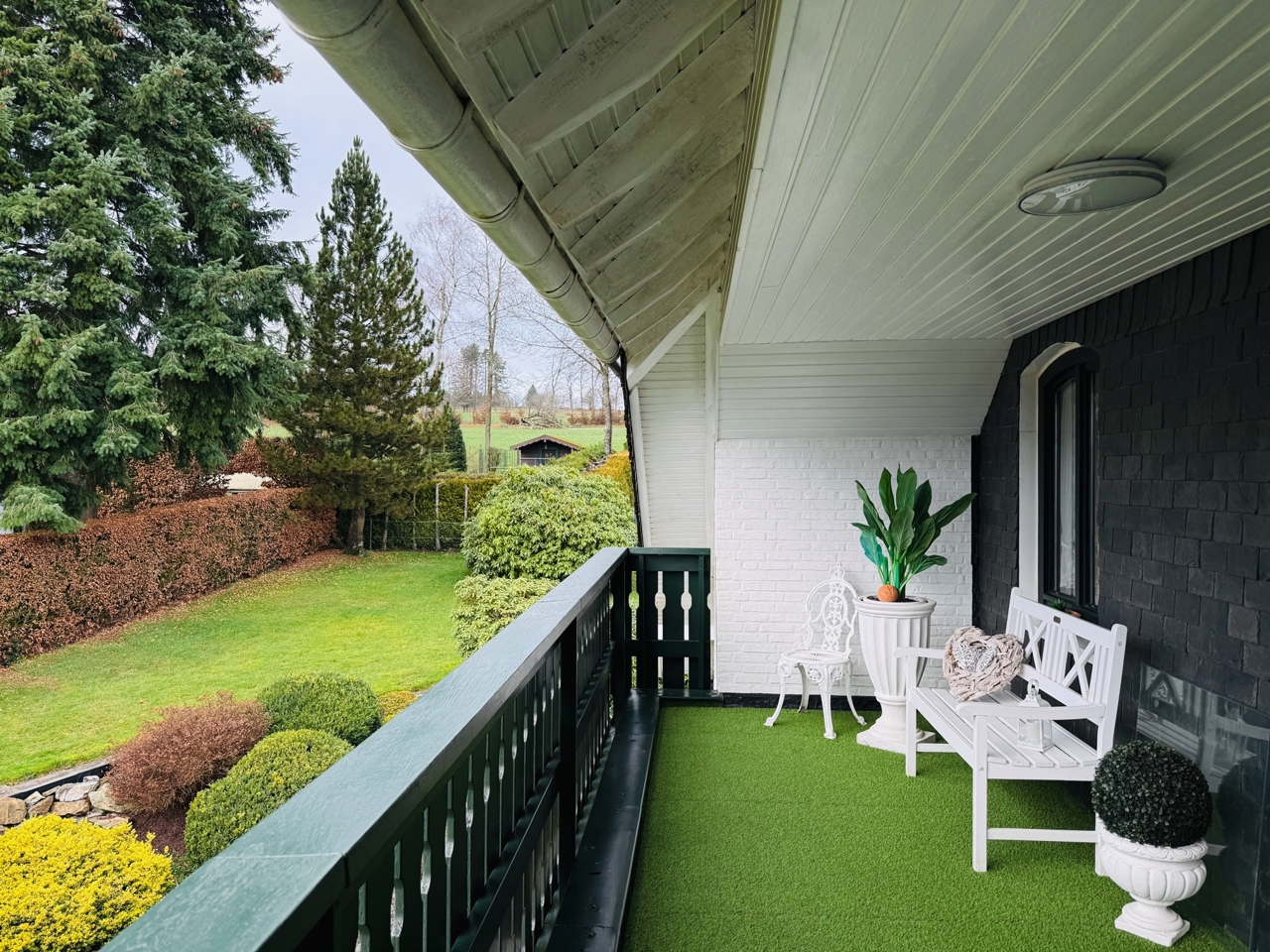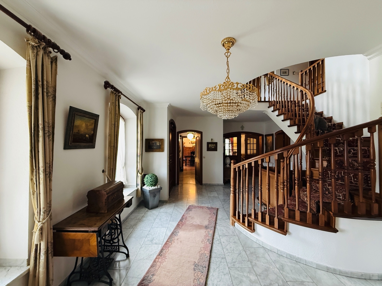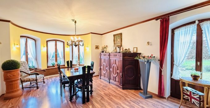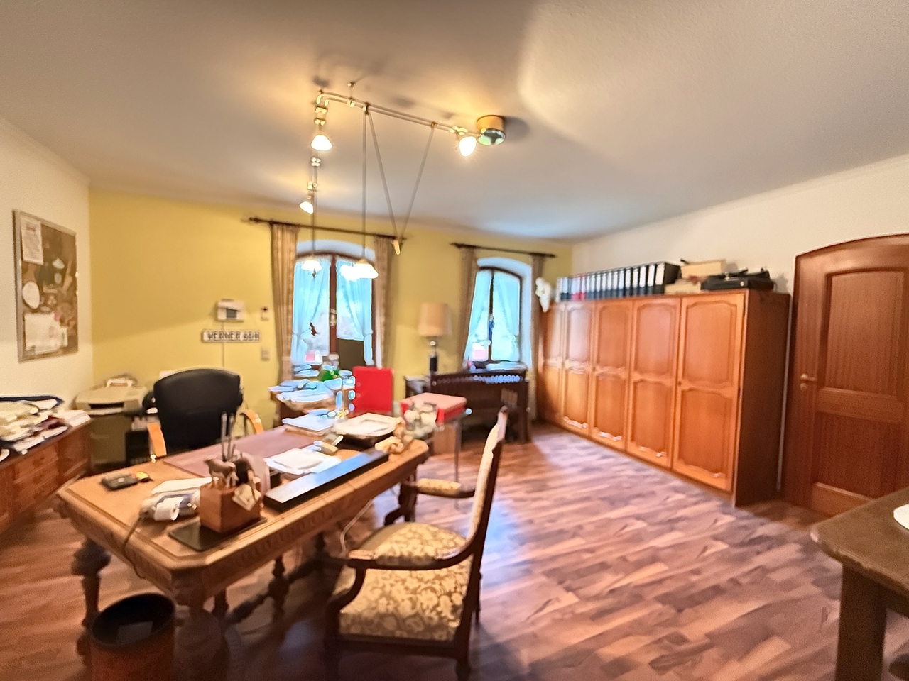 Das freistehende Wohnhaus wurde 1980 als hochwertiges Einfamilienhaus mit integrierter Arztpraxis errichtet und wird heute mit seinen circa 200 m² ausschließlich zu Wohnzwecken genutzt. Von diesen circa 200 m² entfallen etwa 42 m² auf die ehemaligen Praxisräume. Die Architektur ist großzügig und individuell gestaltet, mit einem markanten runden Erker, Fensterläden und einem eindrucksvollen, ebenfalls runden Treppenaufgang. Das Grundstück umfasst ca. 2.487 m² und bietet eine wunderschöne Weitsicht in die umliegende Landschaft. Raumaufteilung Erdgeschoss: Großzügige und einladende Diele, Wohn-Esszimmer mit rundem Erker und großen Fensterflächen, kleine Küche, sehr großes Arbeitszimmer mit angrenzendem Bad, Gäste-WC. Direkter Zugang zur Garage. Obergeschoss: Diele, Gästezimmer, Badezimmer, kleines Zimmer mit besonders schöner Aussicht, großes Schlafzimmer mit Zugang zu einem seitlichen Balkon, zusätzlicher Abstellraum sowie Speicher. Kellergeschoss: Teilunterkellert mit ca. 60 m² Nutzfläche. Ein besonderes architektonisches Merkmal ist die Möglichkeit, auf jeder Etage „rundzugehen“, was den offenen Charakter des Hauses zusätzlich unterstreicht. Das Haus wirkt durch seine teils runden Details verträumt-romantisch und bietet durch die hellen, geräumigen Räume zugleich eine Großzügigkeit.