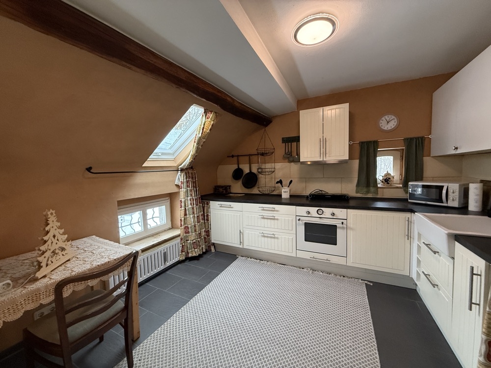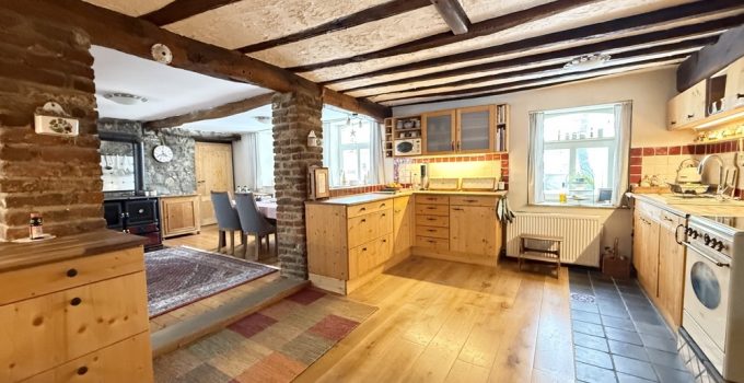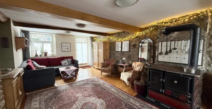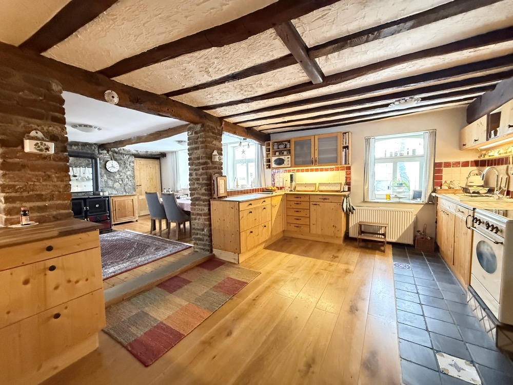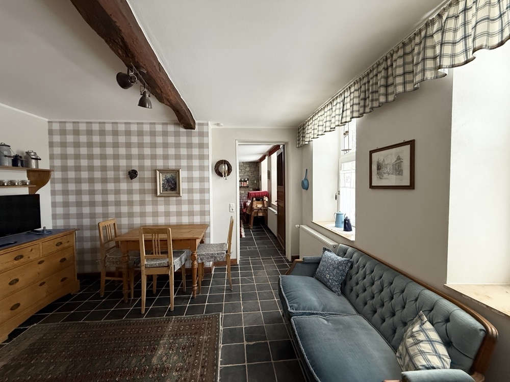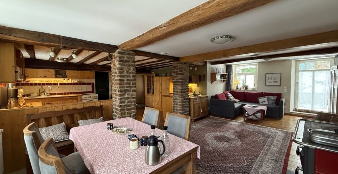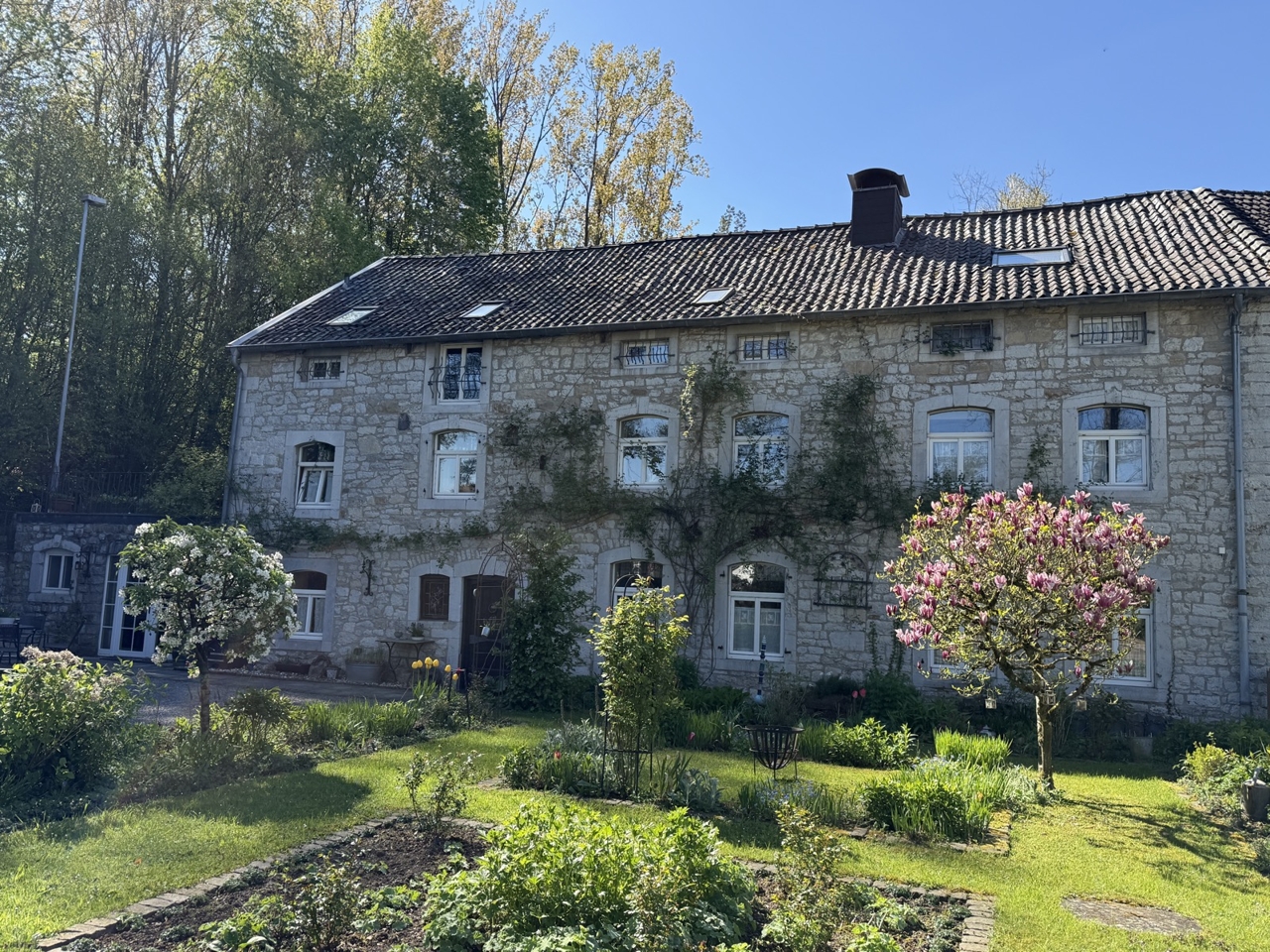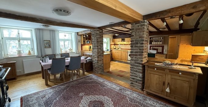 Dieses außergewöhnliche, denkmalgeschützte Bruchsteinhaus im idyllischen Aachen-Hahn verbindet historisches Flair mit einer vielseitigen Nutzungsperspektive. Das Anwesen, bekannt als ehemalige „Hahner Mühle“, wurde Ende des 18. Jahrhunderts errichtet und in den vergangenen Jahrzehnten umfassend saniert sowie fortlaufend instand gehalten. Heute präsentiert sich die Immobilie vor allem als großzügiges Einfamilienhaus mit separater Einliegerwohnung. Dadurch eignet sich das Haus ideal für alle, die stilvoll und großzügig wohnen und zugleich zusätzliche Flächen flexibel nutzen möchten – etwa für Mehrgenerationenwohnen, Arbeiten von zu Hause oder die Vermietung einer abgeschlossenen Einheit, beispielsweise als Ferienwohnung. Besonders reizvoll ist die Kombination aus historischem Charakter, individueller Architektur und den bereits vorhandenen separaten Zugängen zu den einzelnen Bereichen. Terrassen, Gartenflächen und der liebevoll gestaltete Innenhof verleihen dem Anwesen dabei eine besondere Atmosphäre. Raumaufteilung Untergeschoss / Einliegerwohnung (ca. 127 m²) Das Untergeschoss ist von der Vorderseite des Hauses ebenerdig zugänglich und bietet einen eigenständigen, charmanten Wohnbereich mit besonderem Ambiente. Hier befinden sich zwei Schlafzimmer, zwei Bäder, ein Essbereich mit kleiner Küche sowie weitere Nebenräume und ein historischer Gewölbekeller. Durch den sichtbaren Bruchstein, die besondere Raumwirkung und den separaten Zugang bietet sich diese Ebene hervorragend als Einliegerwohnung an. Ebenso ist eine Nutzung zur Ferienvermietung gut vorstellbar. Der Bereich wird derzeit bereits an Feriengäste vermietet; nähere Informationen zu den bisherigen Einnahmen können auf Anfrage zur Verfügung gestellt werden. Obergeschoss und Dachgeschoss / Hauptwohnung (ca. 200 m²) Die Hauptwohnung ist durch die Hanglage von der Rückseite des Hauses ebenerdig erreichbar und erstreckt sich über das Ober- und Dachgeschoss. Im Obergeschoss bildet der großzügige Wohn-Essbereich mit Kaminecke den Mittelpunkt des Wohnens. Von hier aus besteht direkter Zugang zur Terrasse und in den Garten. Ergänzt wird diese Ebene durch die Küche, das Badezimmer sowie zwei weitere Zimmer. Über eine Treppe gelangt man in einen weiteren Schlafbereich im Dachgeschoss. Im Dachgeschoss steht zusätzlich ein großer, offener Wohnbereich mit integrierter Küche und Bad zur Verfügung. Je nach Lebenssituation lässt sich dieser Bereich unterschiedlich nutzen, etwa als privater Rückzugsort, Atelier, Gästebereich oder als abgetrennter Wohnteil für ältere Kinder oder Familienangehörige. So entsteht insgesamt ein Wohnkonzept, das Großzügigkeit und Flexibilität auf seltene Weise miteinander verbindet.